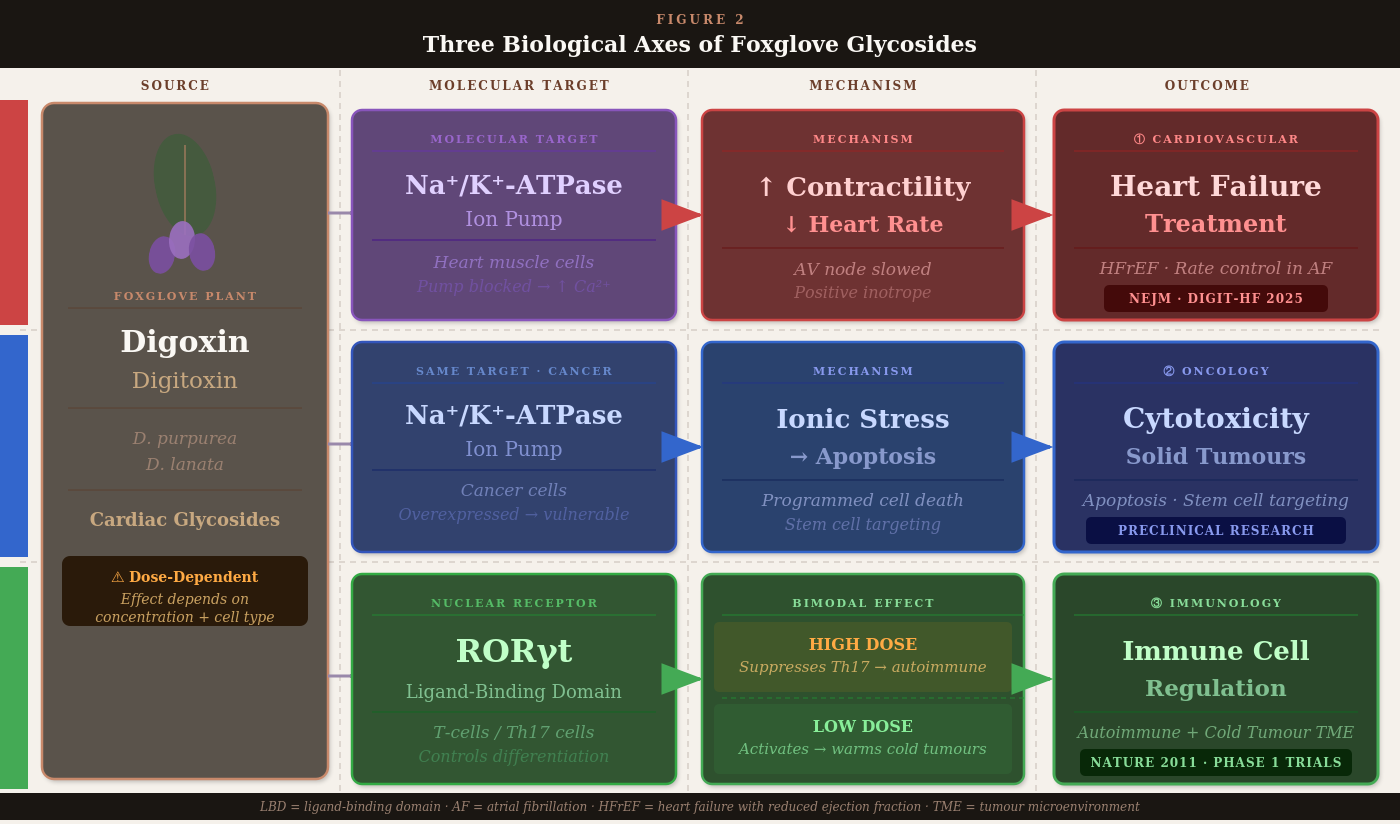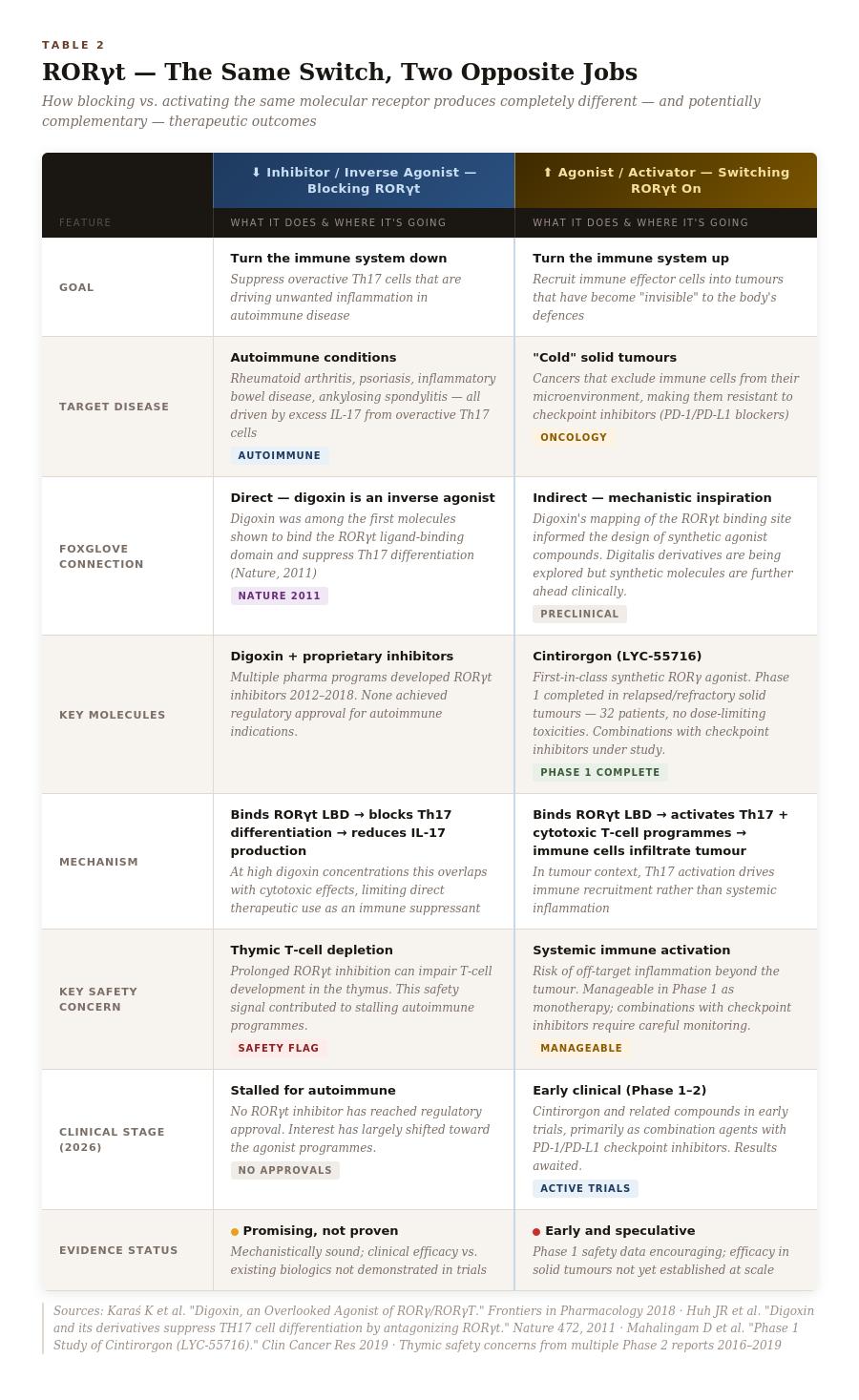 The foxglove connection here is structural and mechanistic rather than direct. Digoxin and its derivatives were first used to map the RORγt binding site and to demonstrate its functional importance. The synthetic agonist programs that followed built on that knowledge. Whether digitalis-derived molecules themselves will be developed as RORγt agonists remains an open question — the margin between their cardiac effects and their immunological effects requires careful pharmacological navigation — but the research is active.