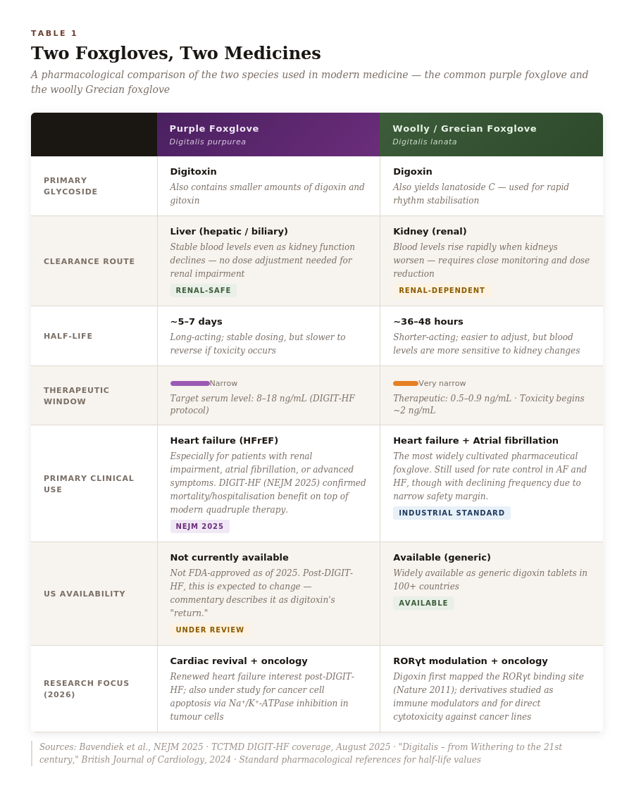 Digitoxin (from Digitalis purpurea, the common purple foxglove): The older sibling. Similar mechanism, longer-acting, and critically — cleared by the liver rather than the kidneys. This matters more than it sounds, as we’ll get to.