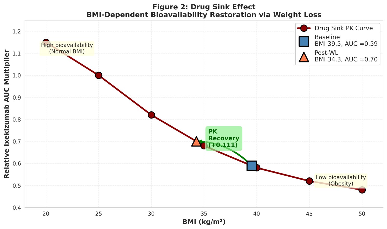 Here’s the mechanism I explored: Obesity increases how much “space” antibodies distribute into (higher Vd) and how fast they get cleared (altered CL). Result? The estimated ixekizumab exposure decreases by ~40% at a BMI of 40 compared with normal BMI (Figure 2). When Zepbound causes weight loss (14.1% mean in TOGETHER), BMI falls from 39.5 to ~32. The model estimated that this recovers ~30% of the lost drug exposure. Plus, adipose tissue stops pumping out inflammatory cytokines (IL-6, TNF-α, IL-23). That’s powerful synergy—but not the kind we usually discuss. This reframes obesity from “comorbidity” to “reversible pharmacokinetic defect.”